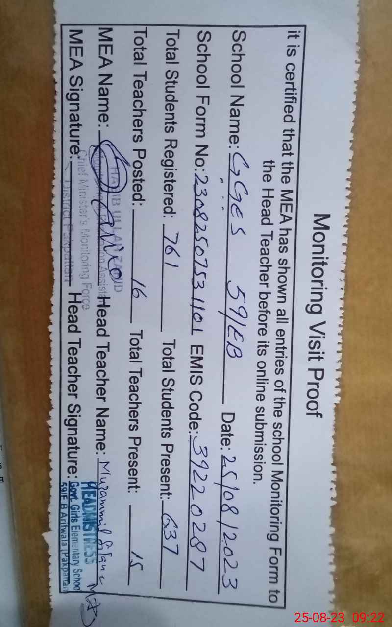 | Attendance Register | Head Teacher | MEA with School | Visit Proof |