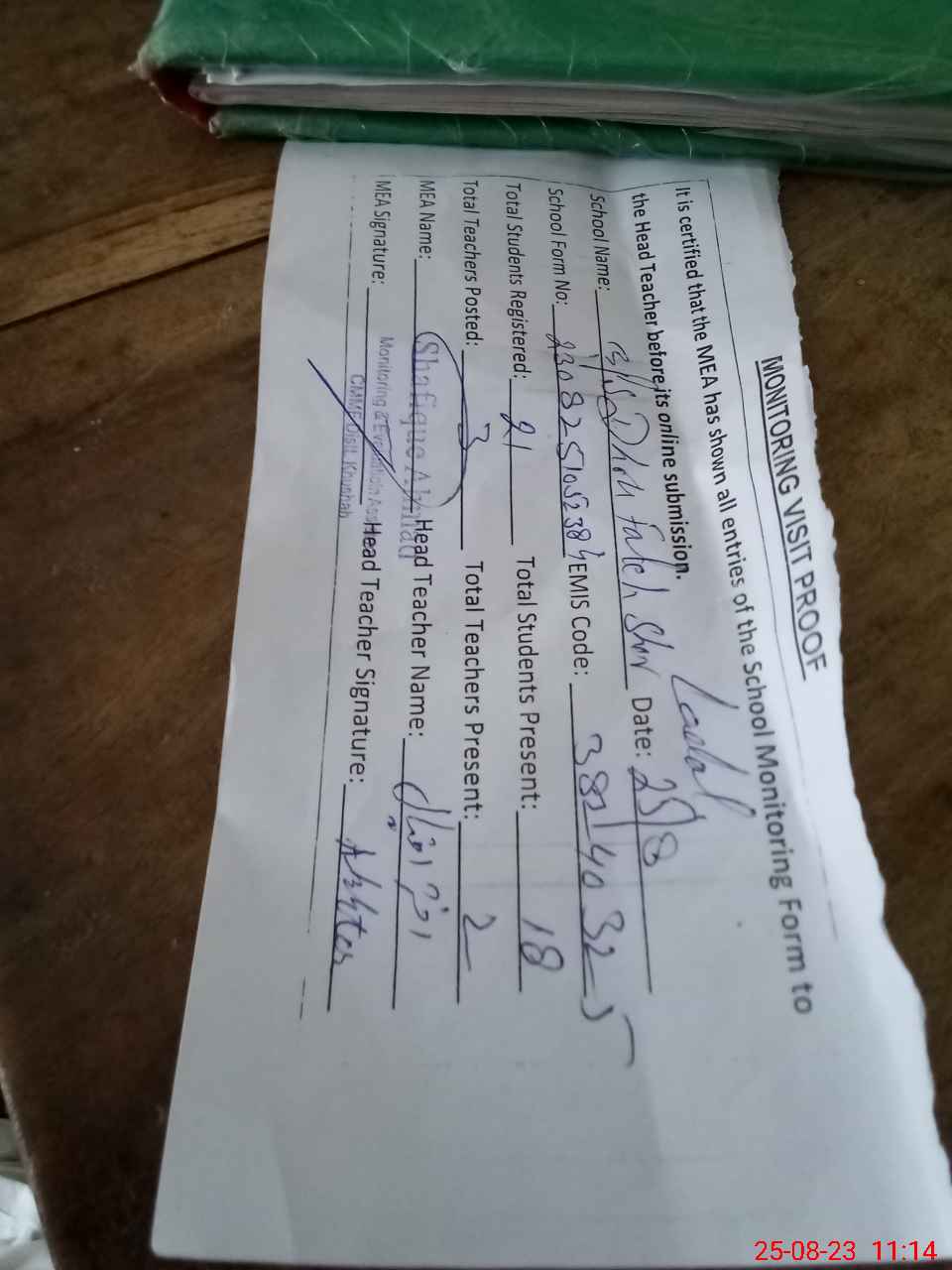 | Attendance Register | Head Teacher | MEA with School | Visit Proof |