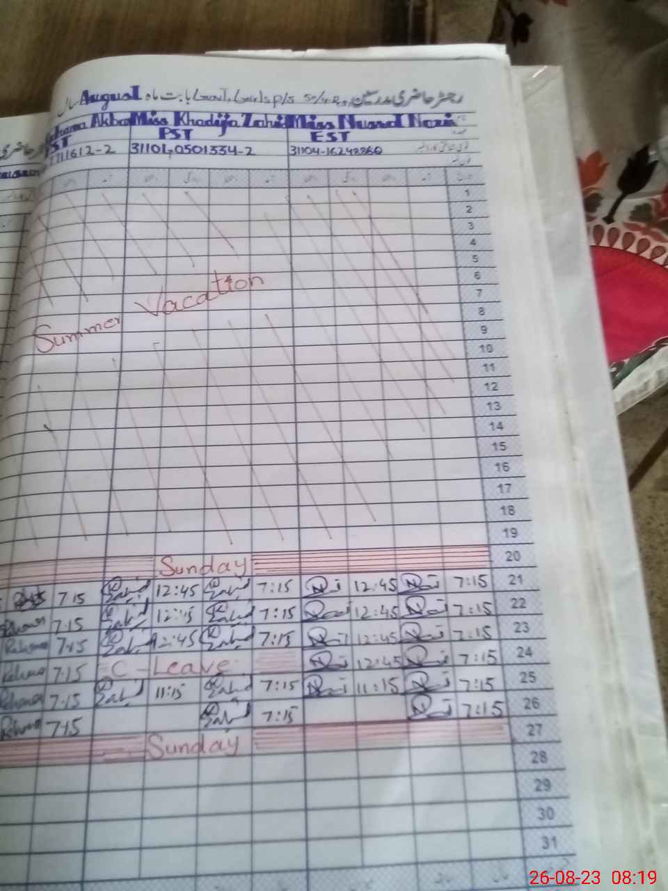 | CNIC | Full Name | Designation | R/C | Absence During Last Calender Month |