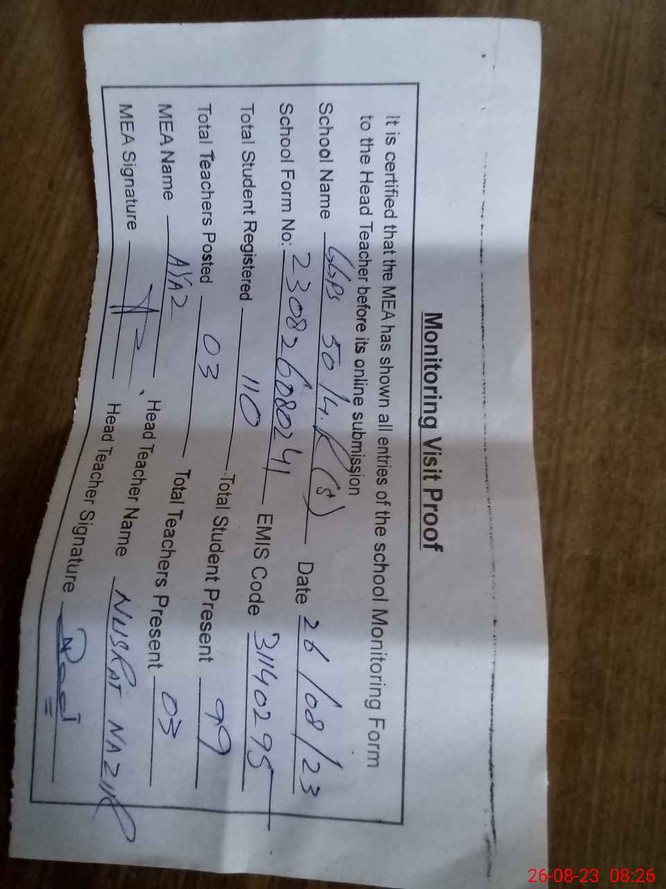 | Attendance Register | Head Teacher | MEA with School | Visit Proof |