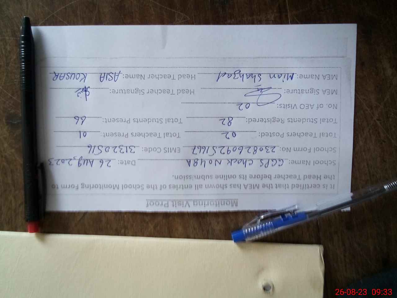 | Monitoring Date: 26-08-2023 | Start Time: 26-08-2023 08:25 AM | End Time: 26-08-2023 09:33 AM | Name of MEA: Sh**** Ah**** | |