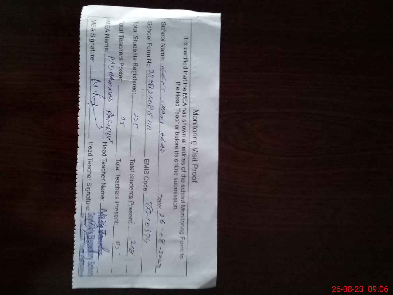 | Attendance Register | Head Teacher | MEA with School | Visit Proof |