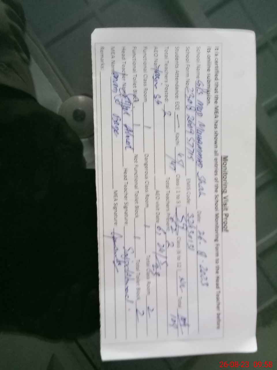 | Attendance Register | Head Teacher | MEA with School | Visit Proof |