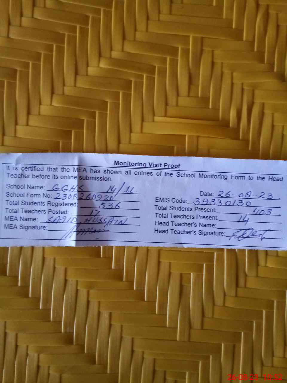 | Attendance Register | Head Teacher | MEA with School | Visit Proof |