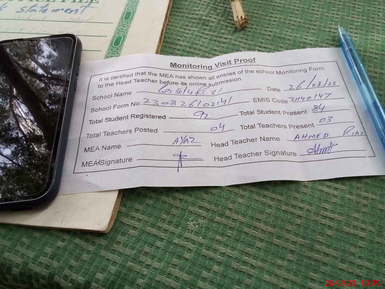 | Attendance Register | Head Teacher | MEA with School | Visit Proof |