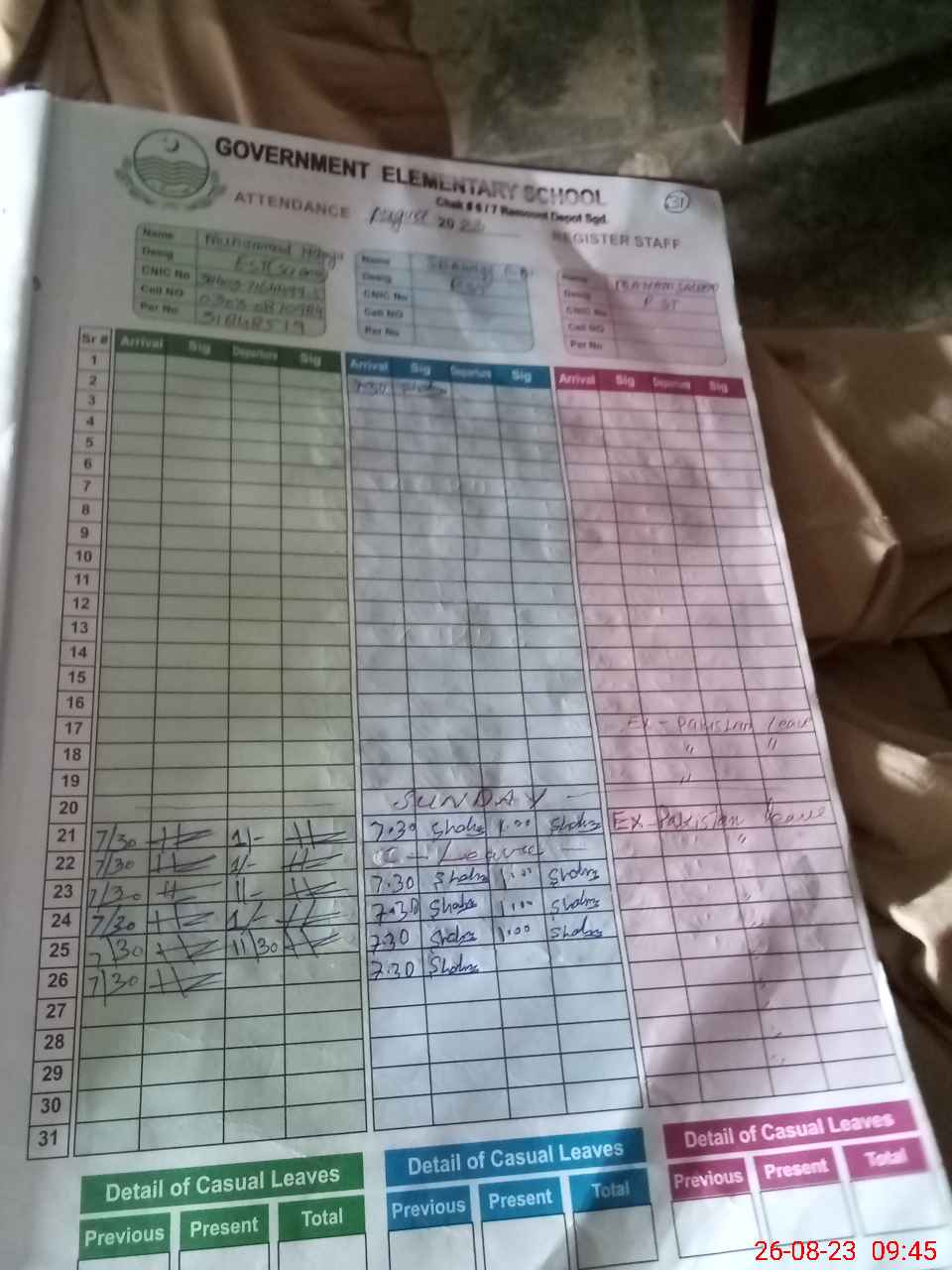 | CNIC | Full Name | Designation | R/C | Absence during last cal. month |