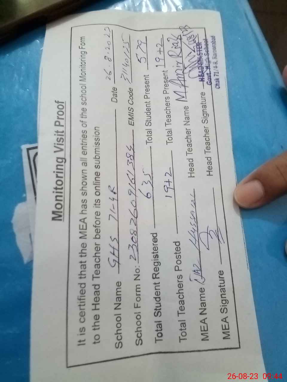 | Attendance Register | Head Teacher | MEA with School | Visit Proof |