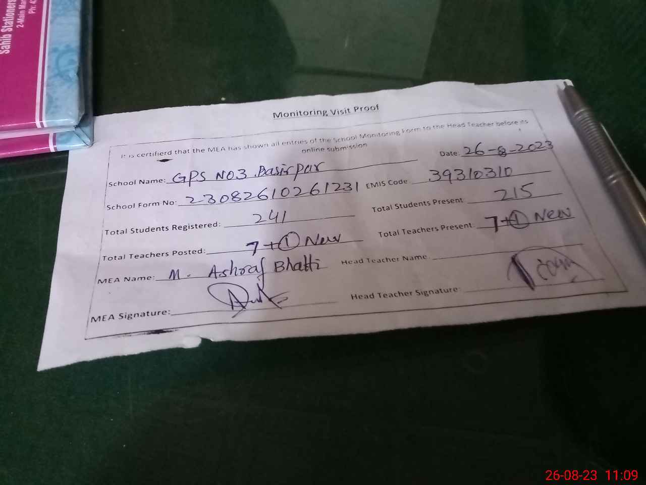 | Attendance Register | Head Teacher | MEA with School | Visit Proof |