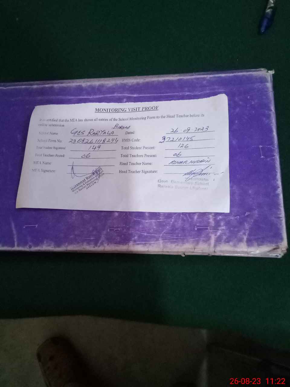 | Attendance Register | Head Teacher | MEA with School | Visit Proof |