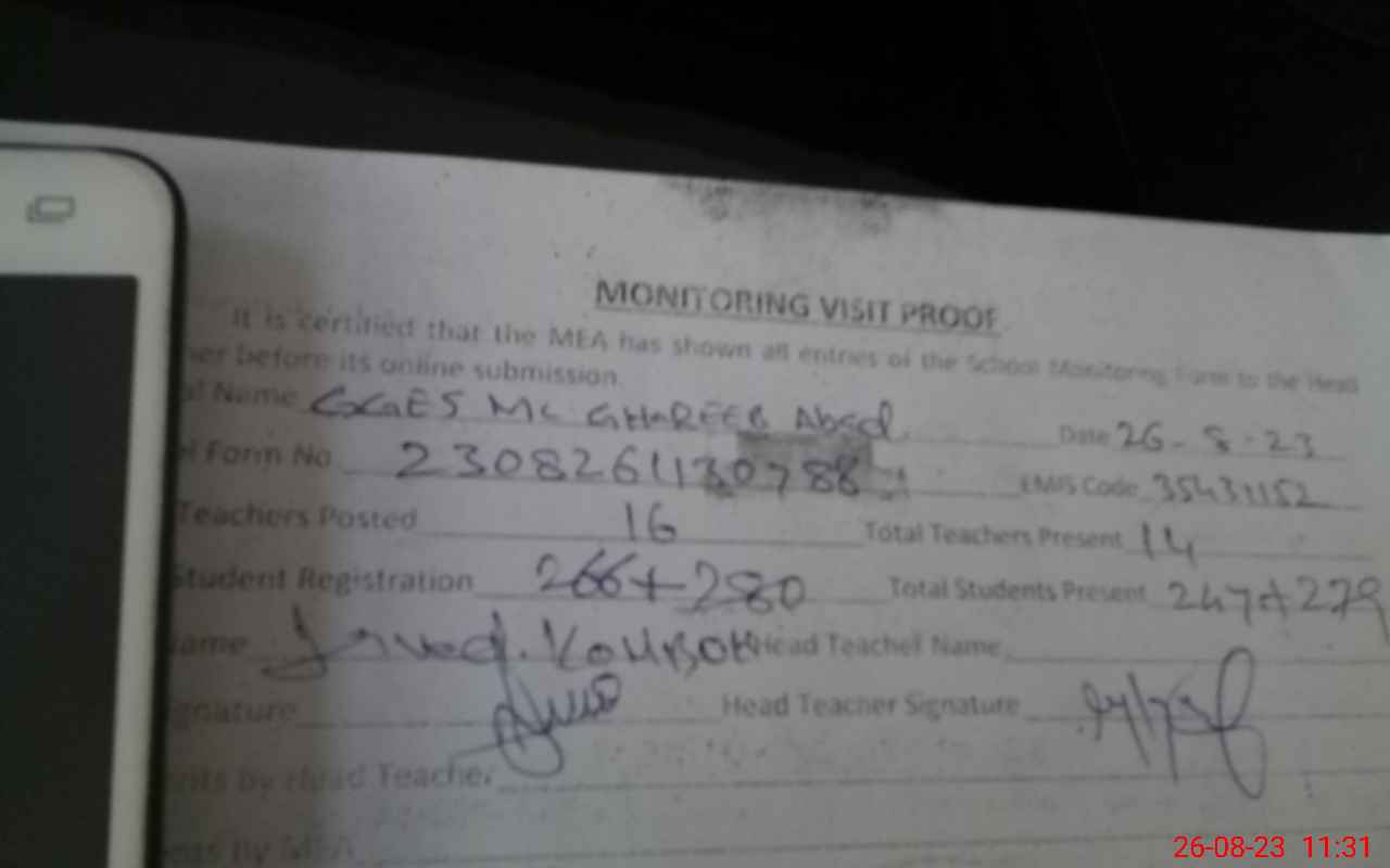 | Attendance Register | Head Teacher | MEA with School | Visit Proof |