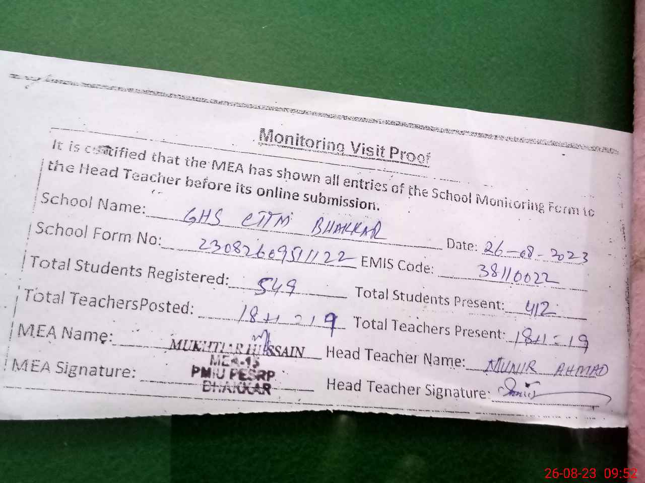 | Certified that this School was Inspected by the Undersigned MEA/DMO Today and the Information Stated Above is as Per Record. | |||||