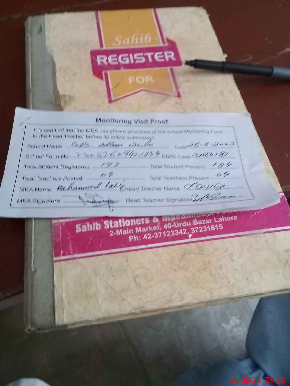 | Attendance Register | Head Teacher | MEA with School | Visit Proof |