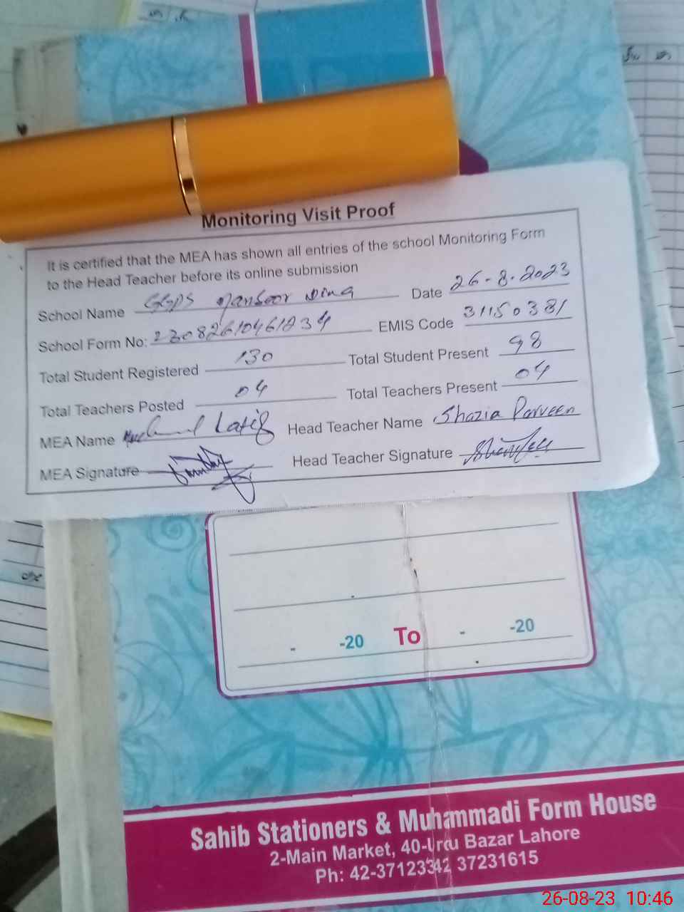 | Attendance Register | Head Teacher | MEA with School | Visit Proof |