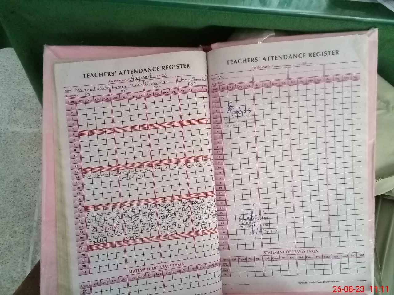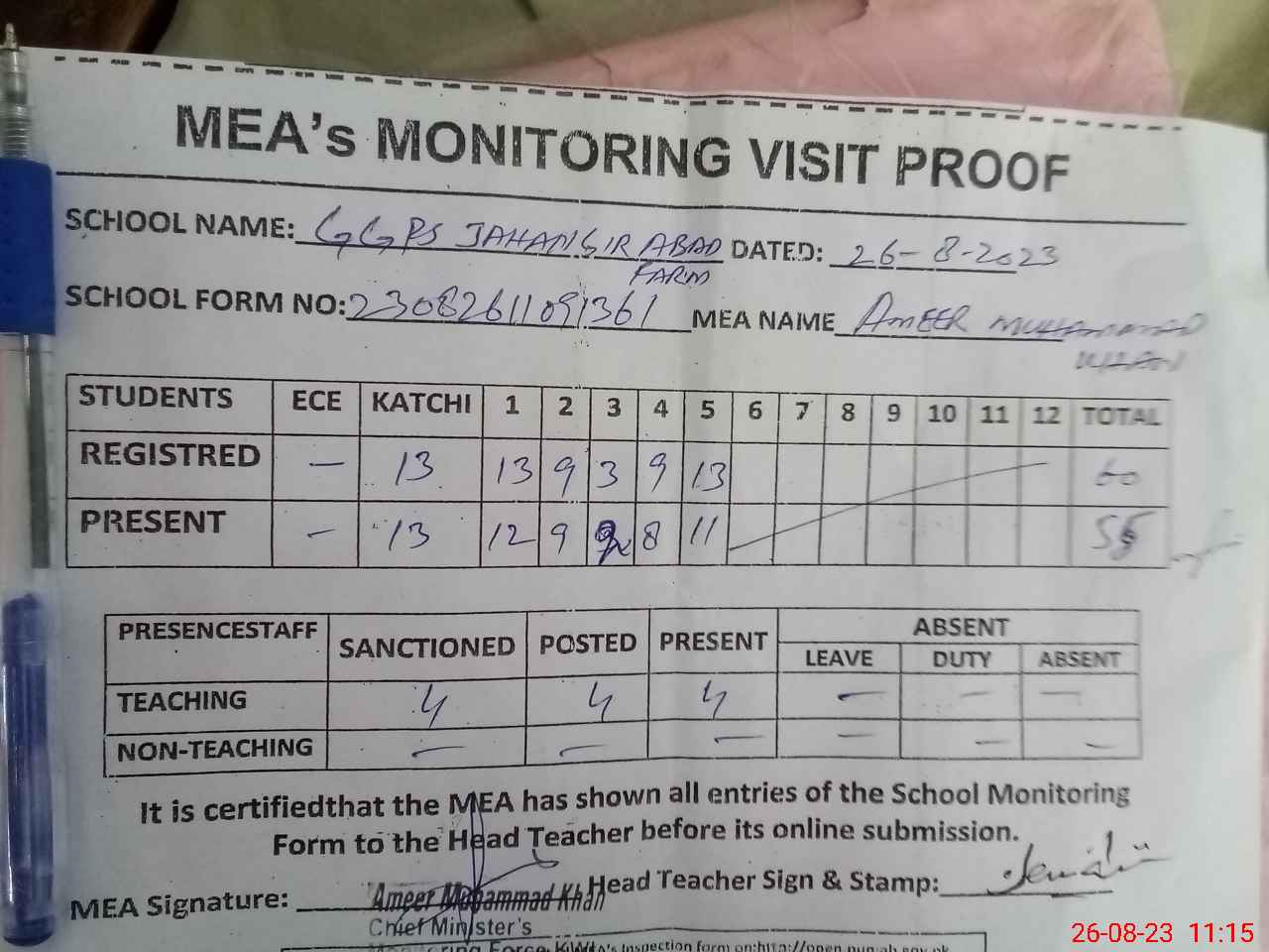 | Attendance Register | Head Teacher | MEA with School | Visit Proof |