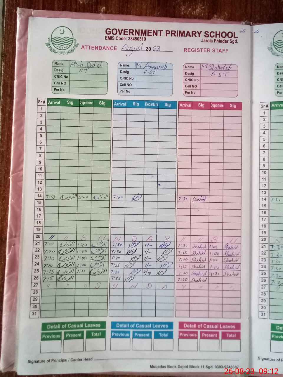 | CNIC | Full Name | Designation | R/C | Absence During Last Calender Month |