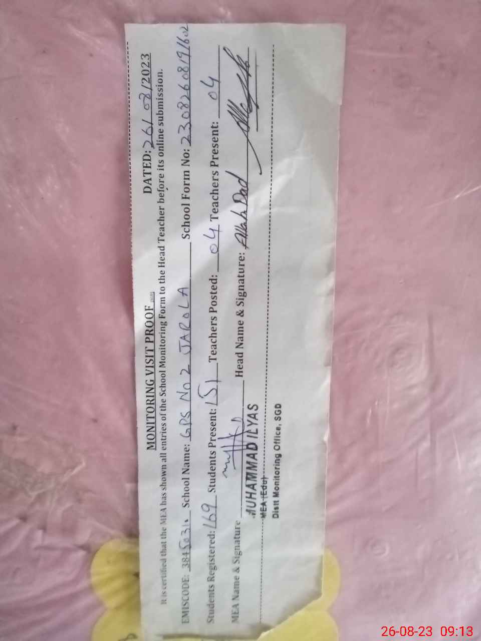| Certified that this School was Inspected by the Undersigned MEA/DMO Today and the Information Stated Above is as Per Record. | |||||