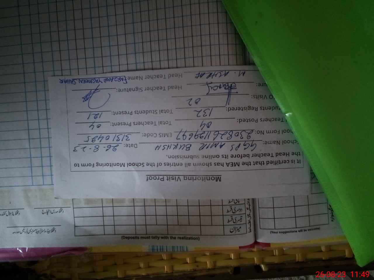 | Attendance Register | Head Teacher | MEA with School | Visit Proof |