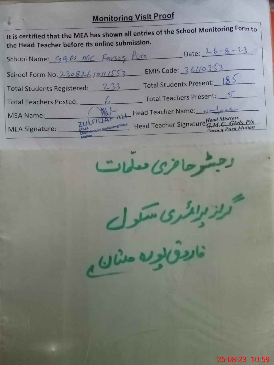 | Attendance Register | Head Teacher | MEA with School | Visit Proof |