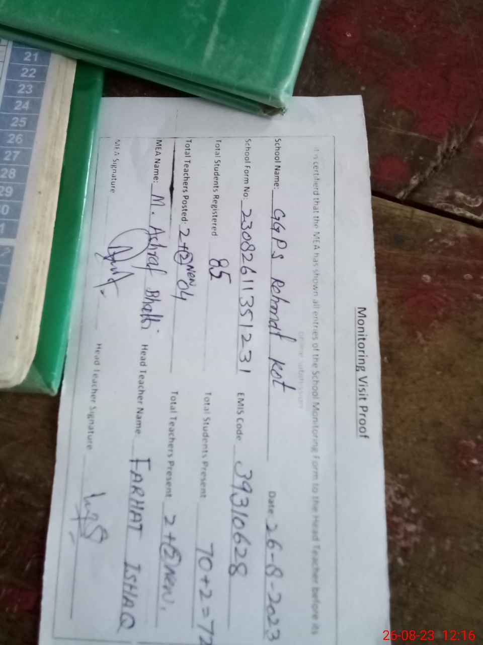 | Attendance Register | Head Teacher | MEA with School | Visit Proof |