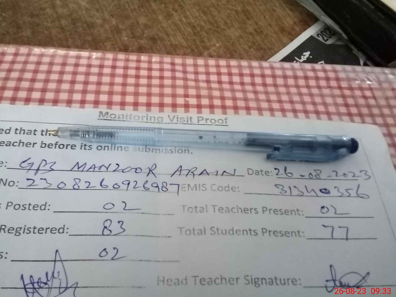 | Attendance Register | Head Teacher | MEA with School | Visit Proof |