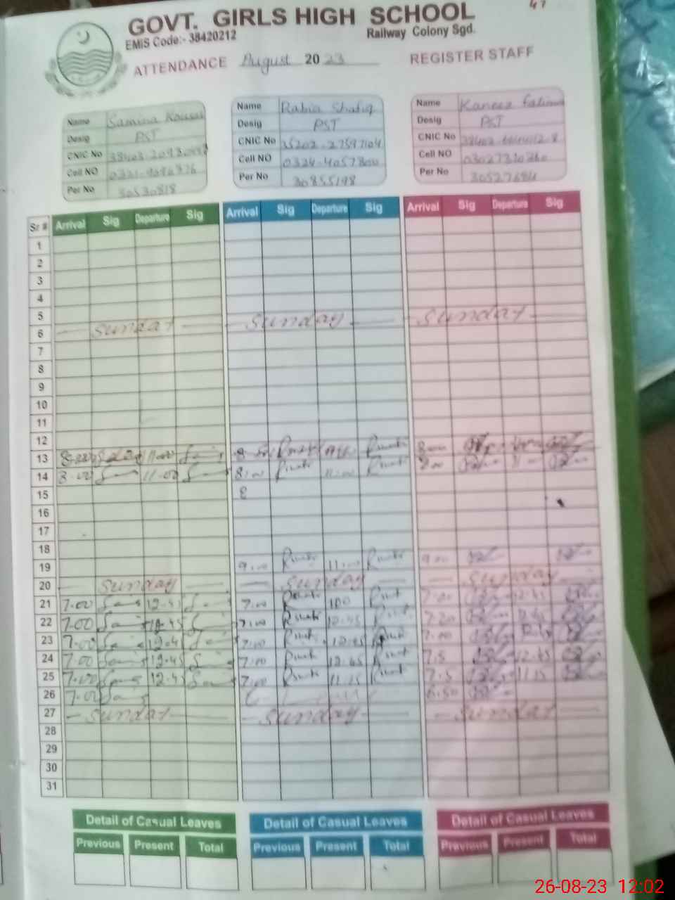 | EMIS Code: 38420212 | Name of School: GGHS RAILWAY COLONY SARGODHA | |||