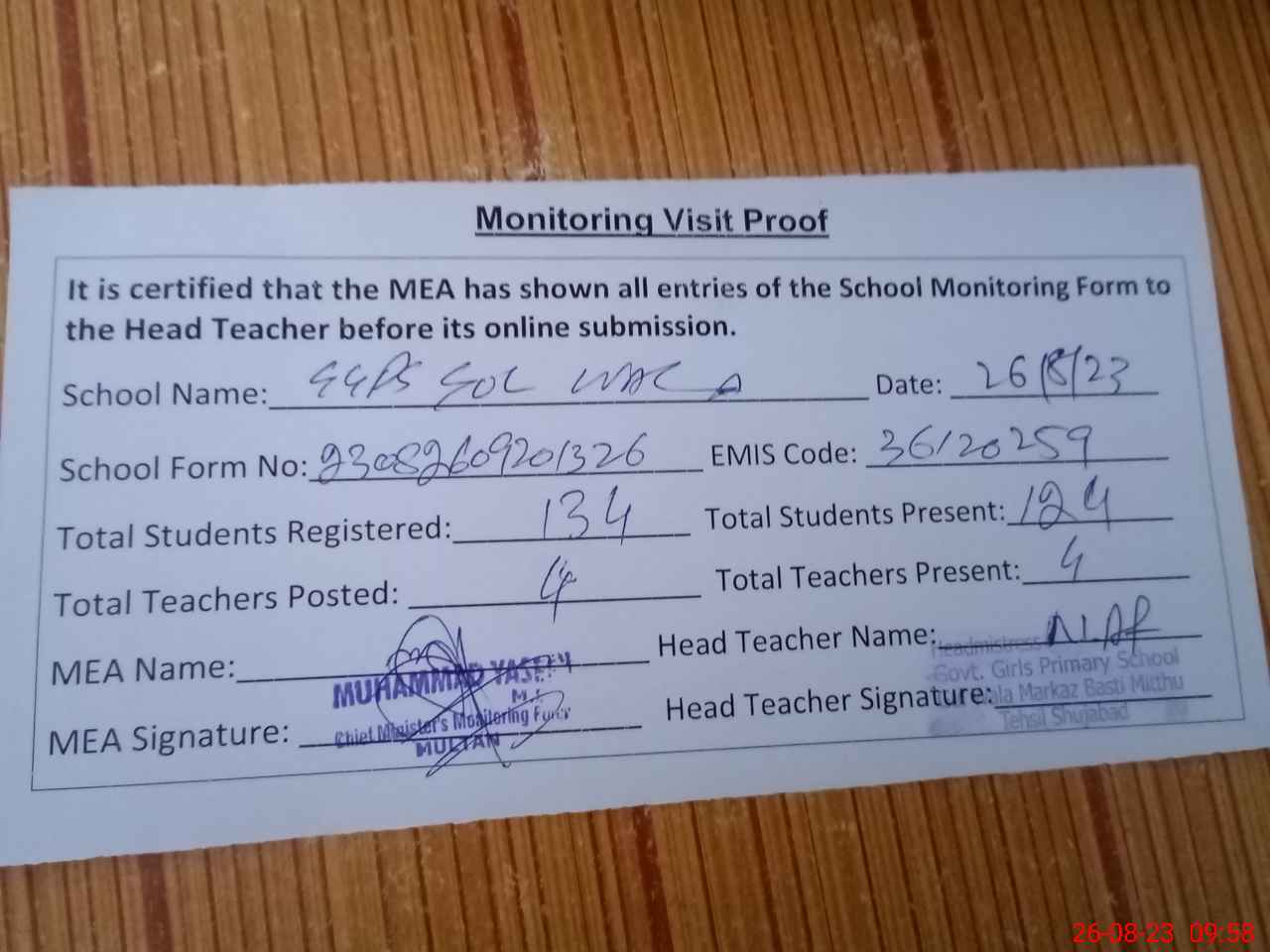 | Monitoring Date: 26-08-2023 | Start Time: 26-08-2023 09:20 AM | End Time: 26-08-2023 09:58 AM | Name of MEA: MU**** YA**** | |