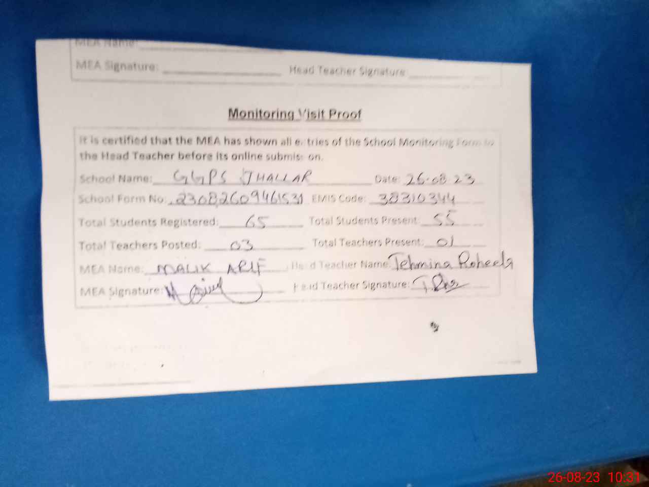 | Attendance Register | Head Teacher | MEA with School | Visit Proof |