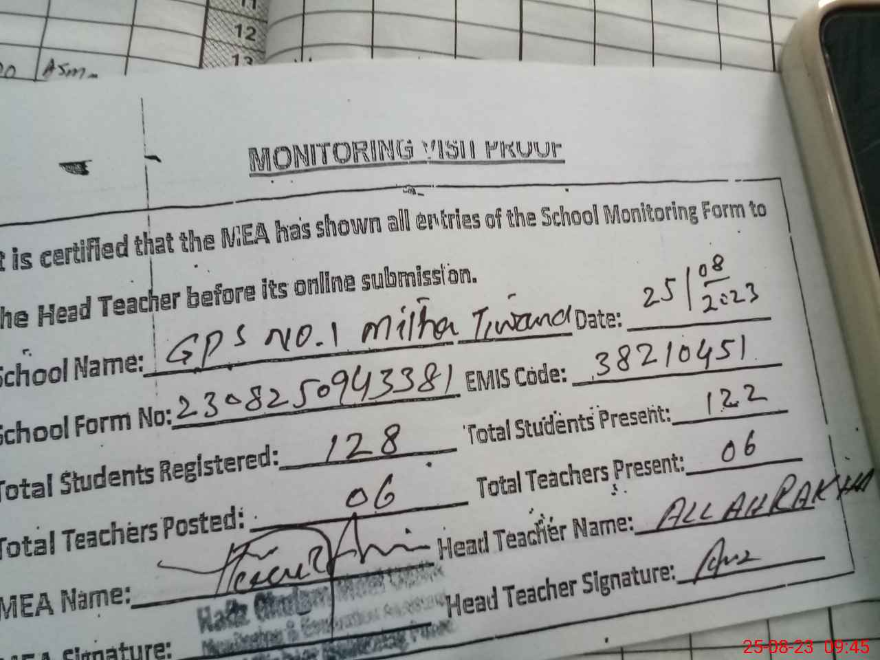 | Attendance Register | Head Teacher | MEA with School | Visit Proof |