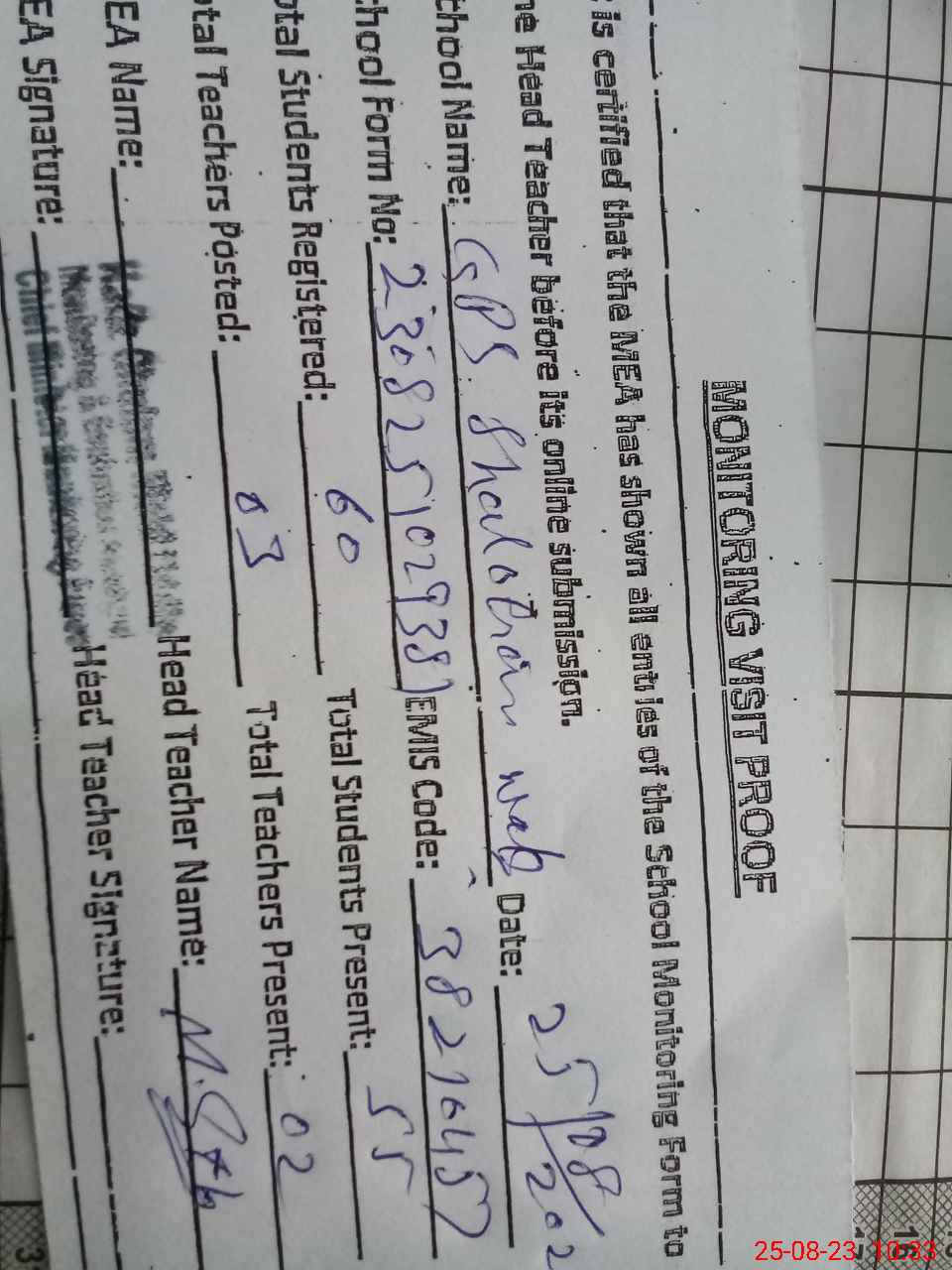 | Attendance Register | Head Teacher | MEA with School | Visit Proof |