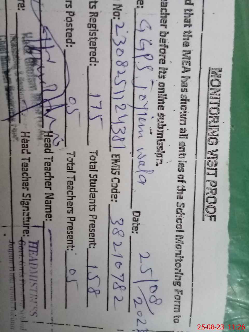| EMIS Code: 38210782 | Name of School: GGPS JOIYAN WALA | |||