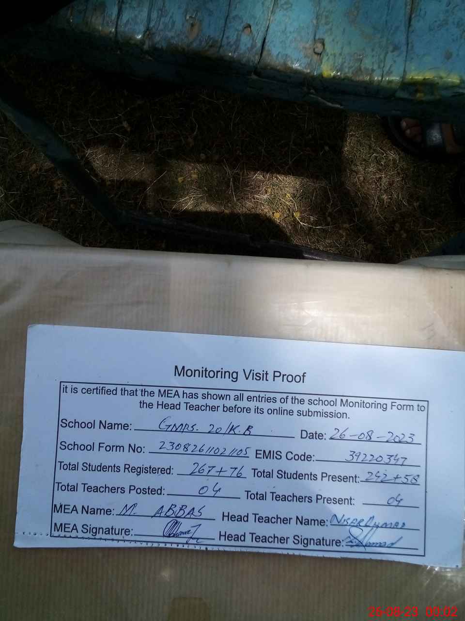| Attendance Register | Head Teacher | MEA with School | Visit Proof |