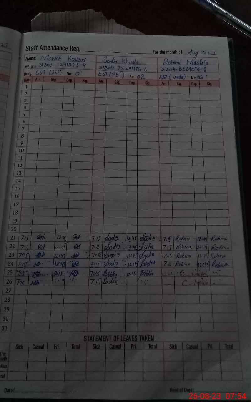 | CNIC | Full Name | Designation | R/C | Absence During Last Calender Month |