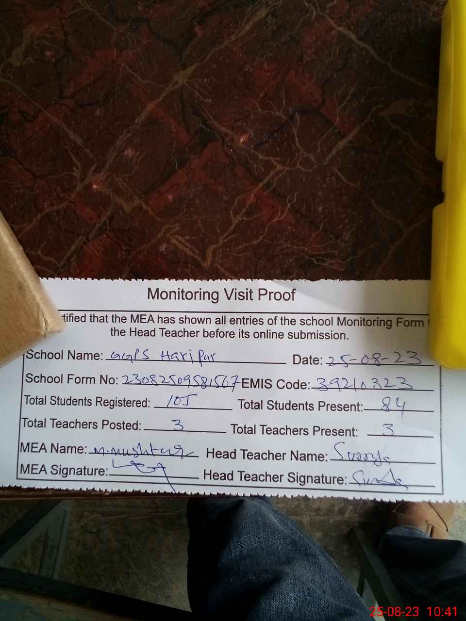 | Attendance Register | Head Teacher | MEA with School | Visit Proof |