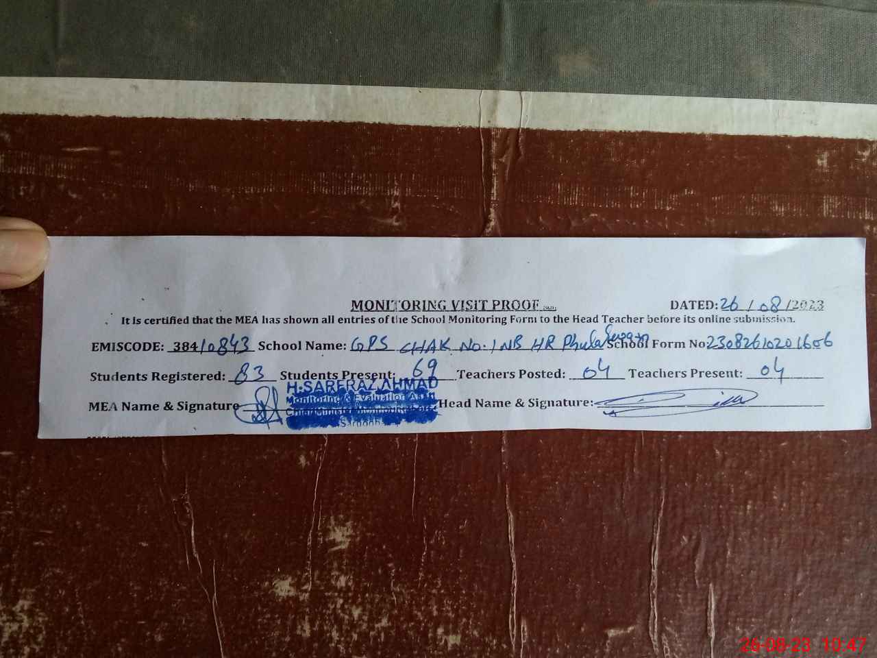 | Attendance Register | Head Teacher | MEA with School | Visit Proof |