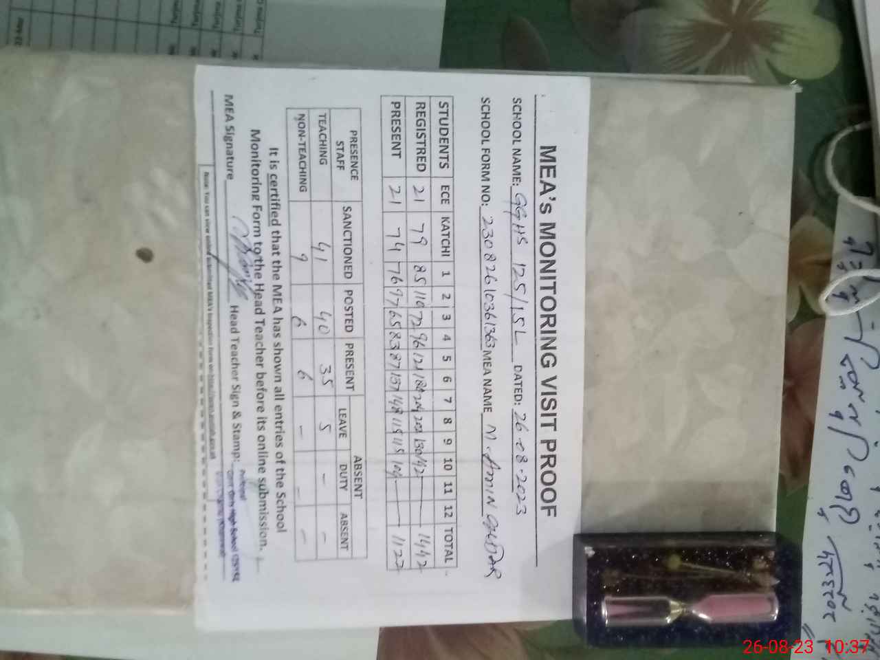 | Attendance Register | Head Teacher | MEA with School | Visit Proof |