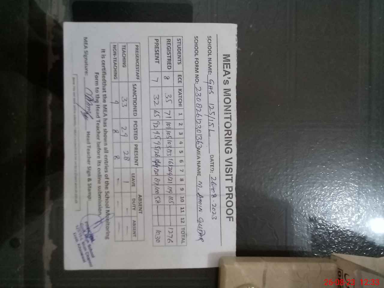 | Attendance Register | Head Teacher | MEA with School | Visit Proof |