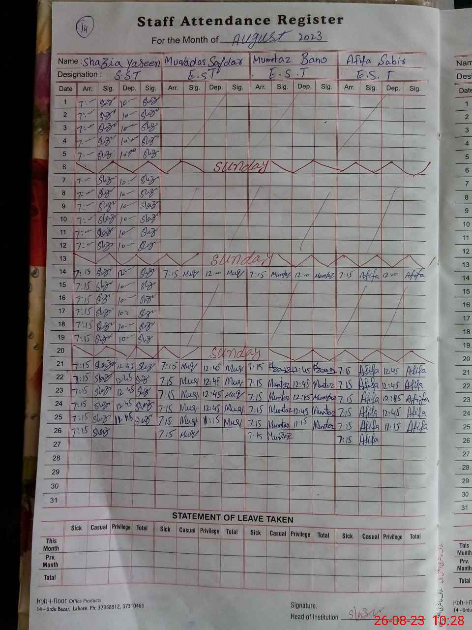 | Monitoring Date: 26-08-2023 | Start Time: 26-08-2023 10:28 AM | End Time: 26-08-2023 10:54 AM | Name of MEA: Za**** Iq**** | |