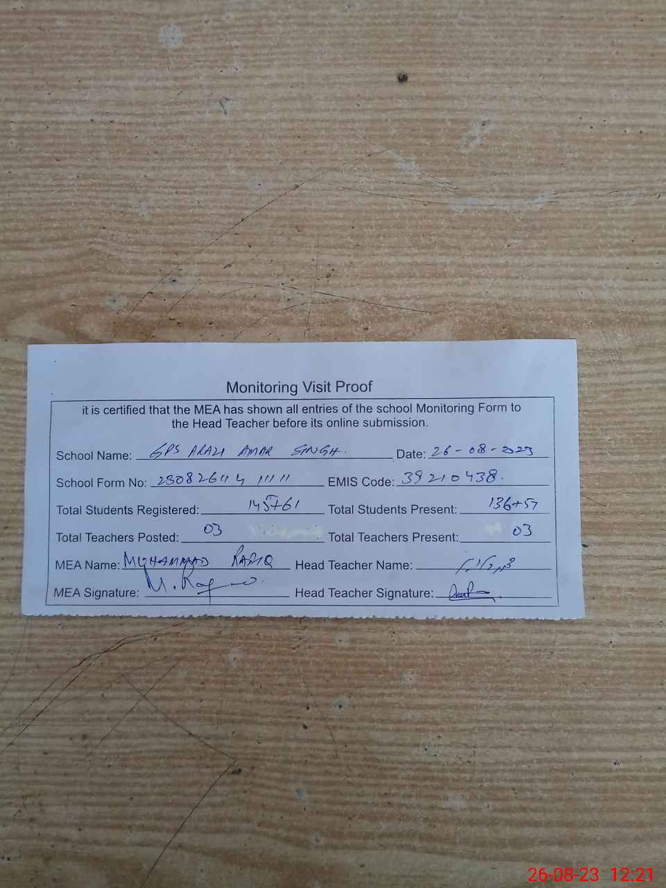 | EMIS Code: 39210438 | Name of School: GPS ARAZI AMAR SINGH | |||