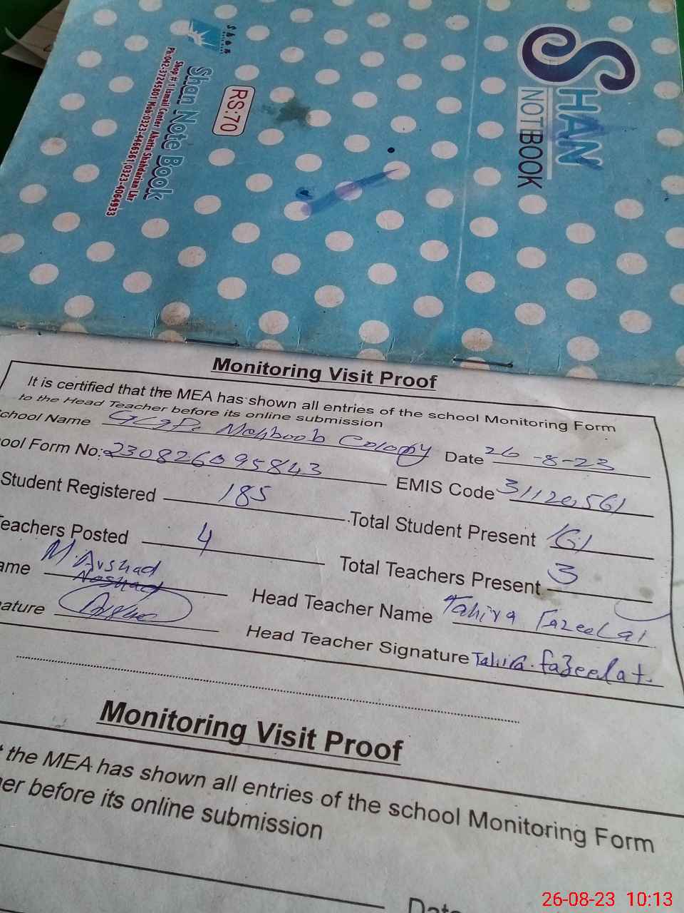 | Attendance Register | Head Teacher | MEA with School | Visit Proof |