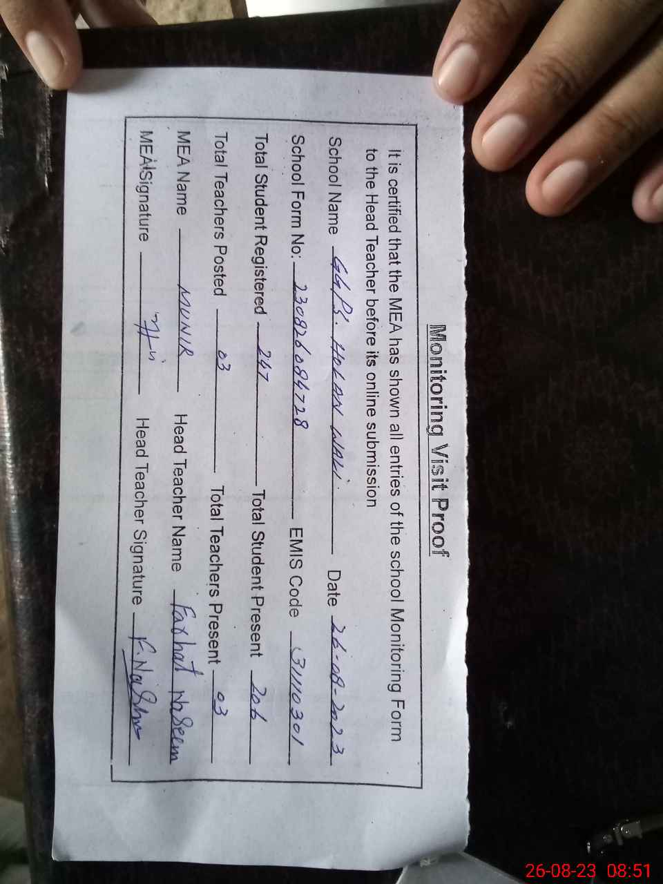 | Attendance Register | Head Teacher | MEA with School | Visit Proof |