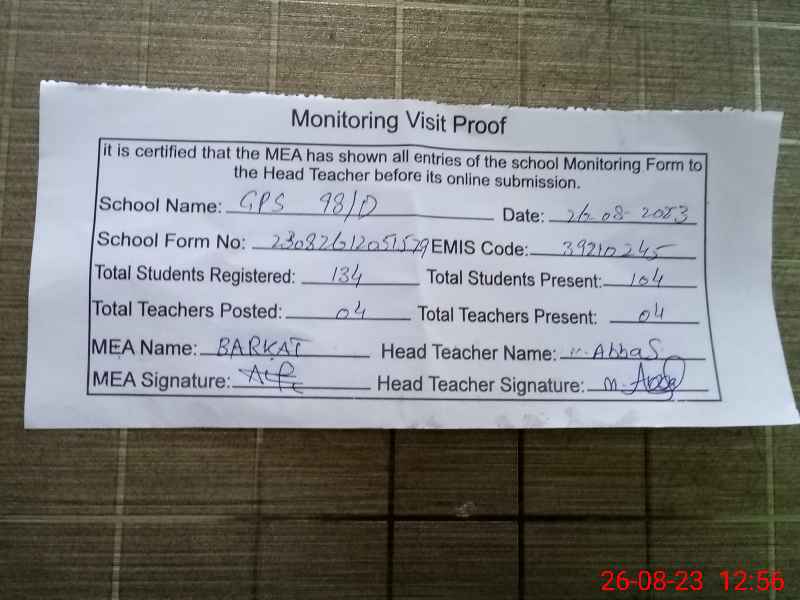| EMIS Code: 39210245 | Name of School: GPS CHAK NO. 98/D | |||