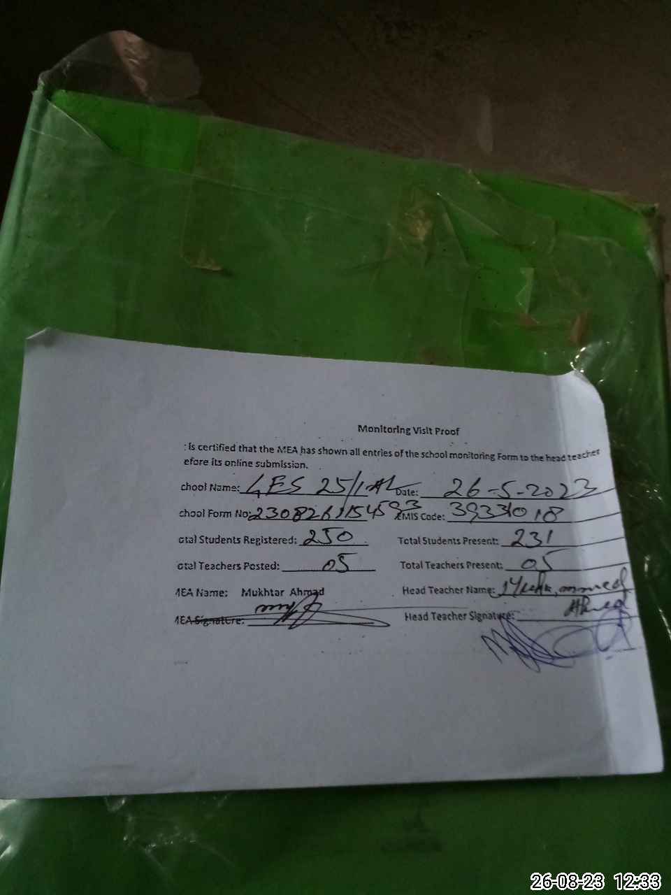 | Attendance Register | Head Teacher | MEA with School | Visit Proof |