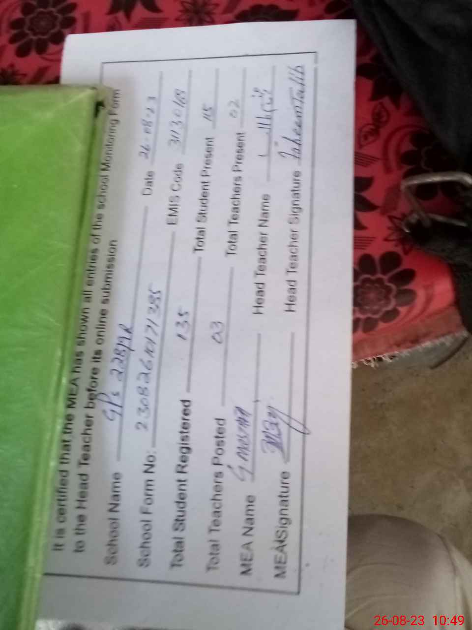 | Attendance Register | Head Teacher | MEA with School | Visit Proof |