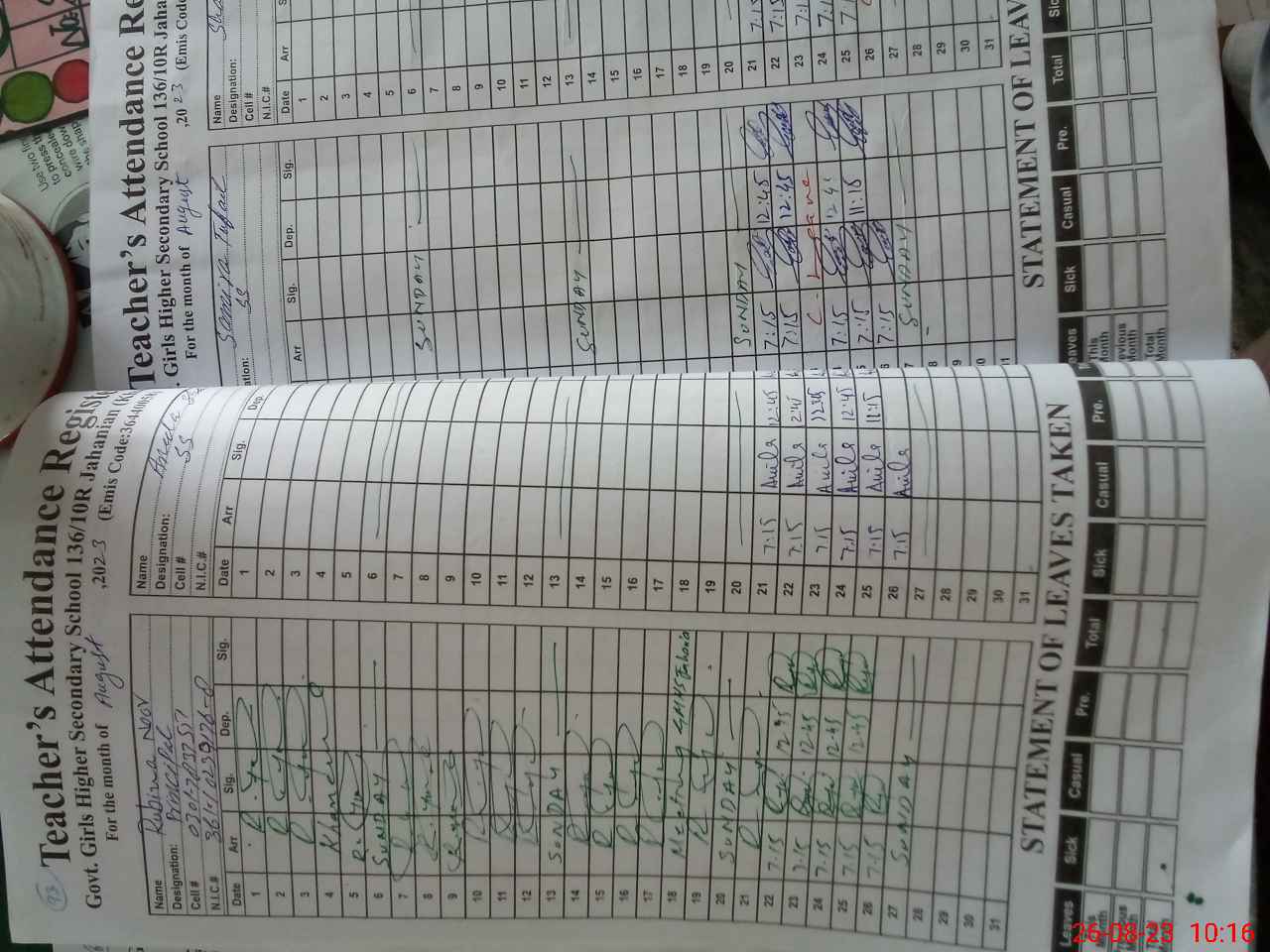 | CNIC | Full Name | Designation | R/C | Absence During Last Calender Month |
