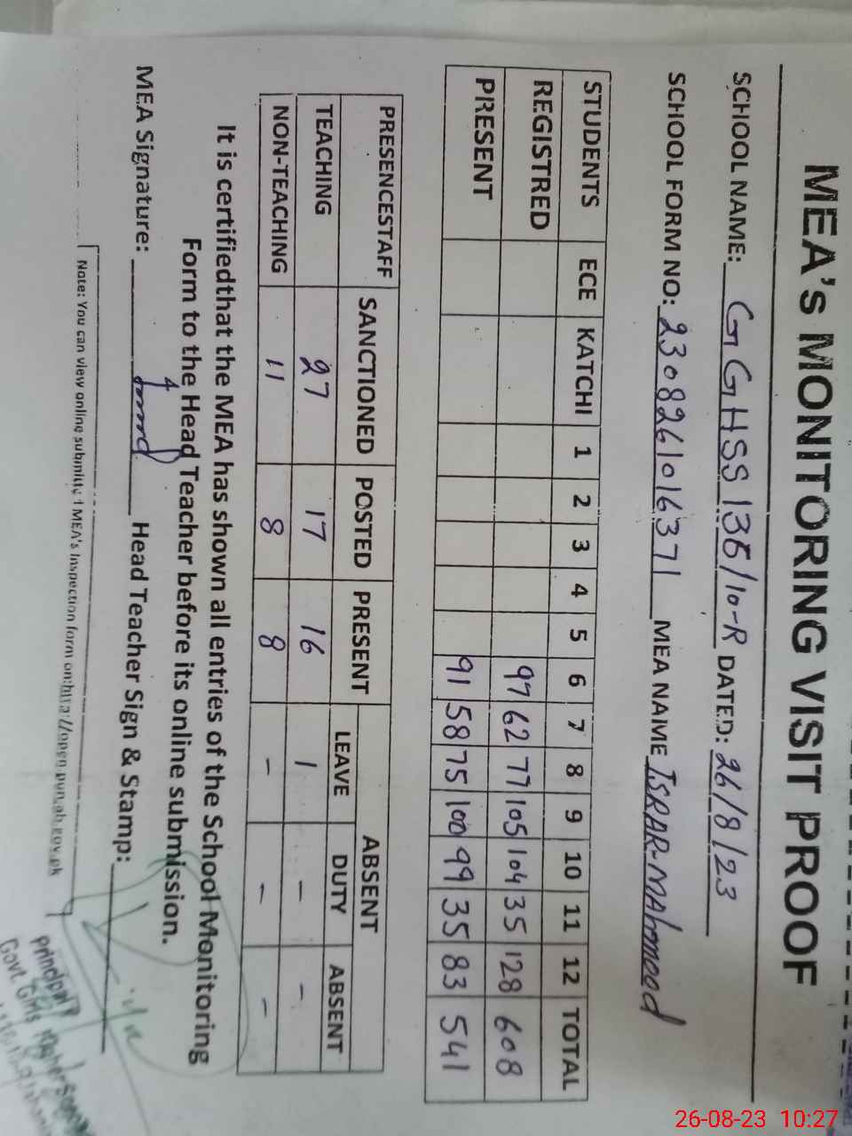 | Attendance Register | Head Teacher | MEA with School | Visit Proof |