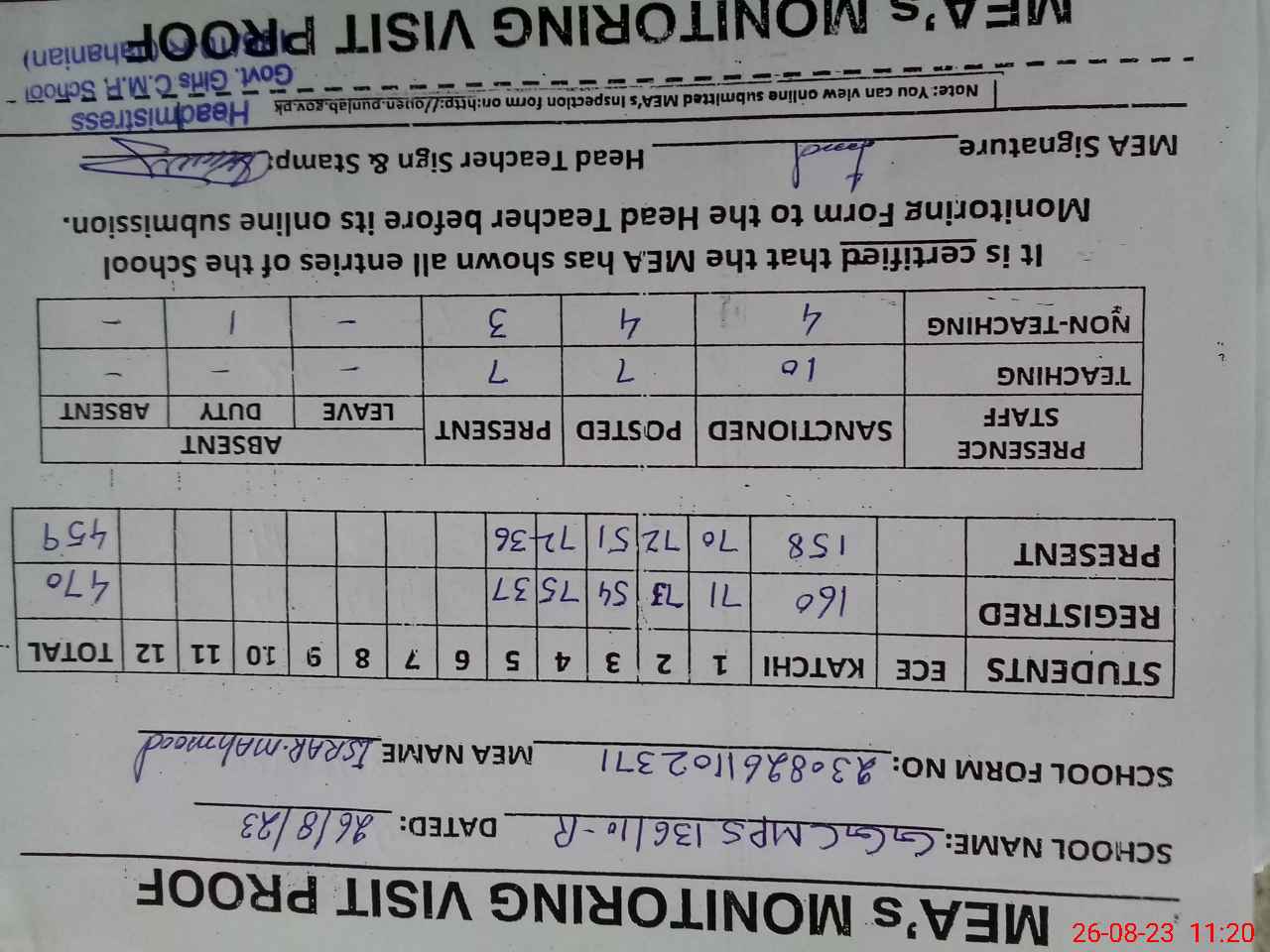 | Attendance Register | Head Teacher | MEA with School | Visit Proof |