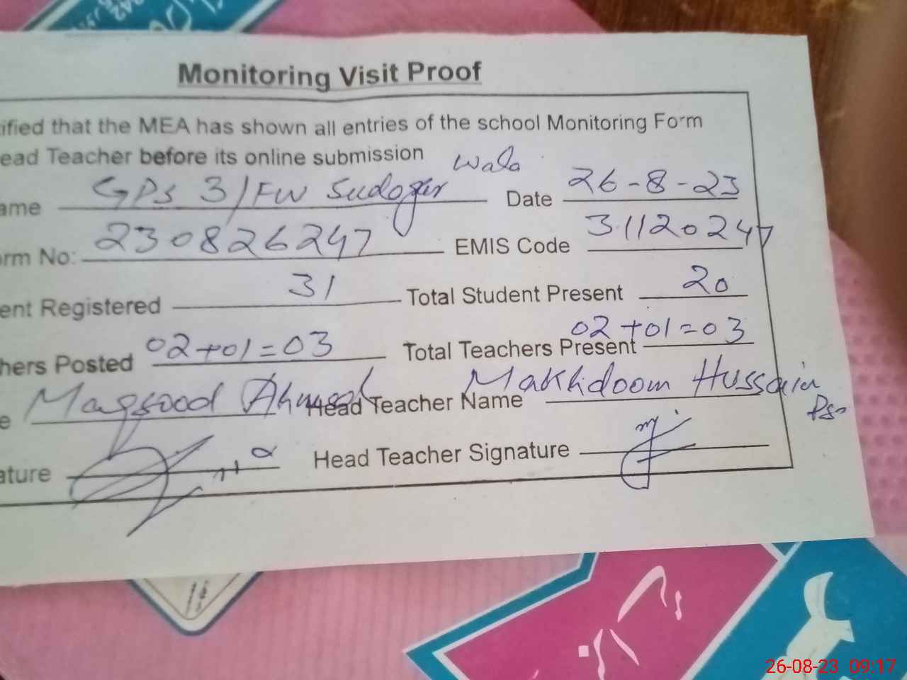 | Attendance Register | Head Teacher | MEA with School | Visit Proof |