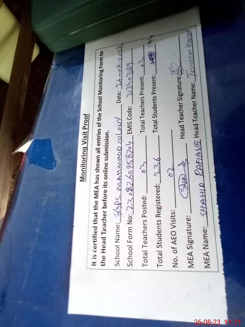 | Attendance Register | Head Teacher | MEA with School | Visit Proof |