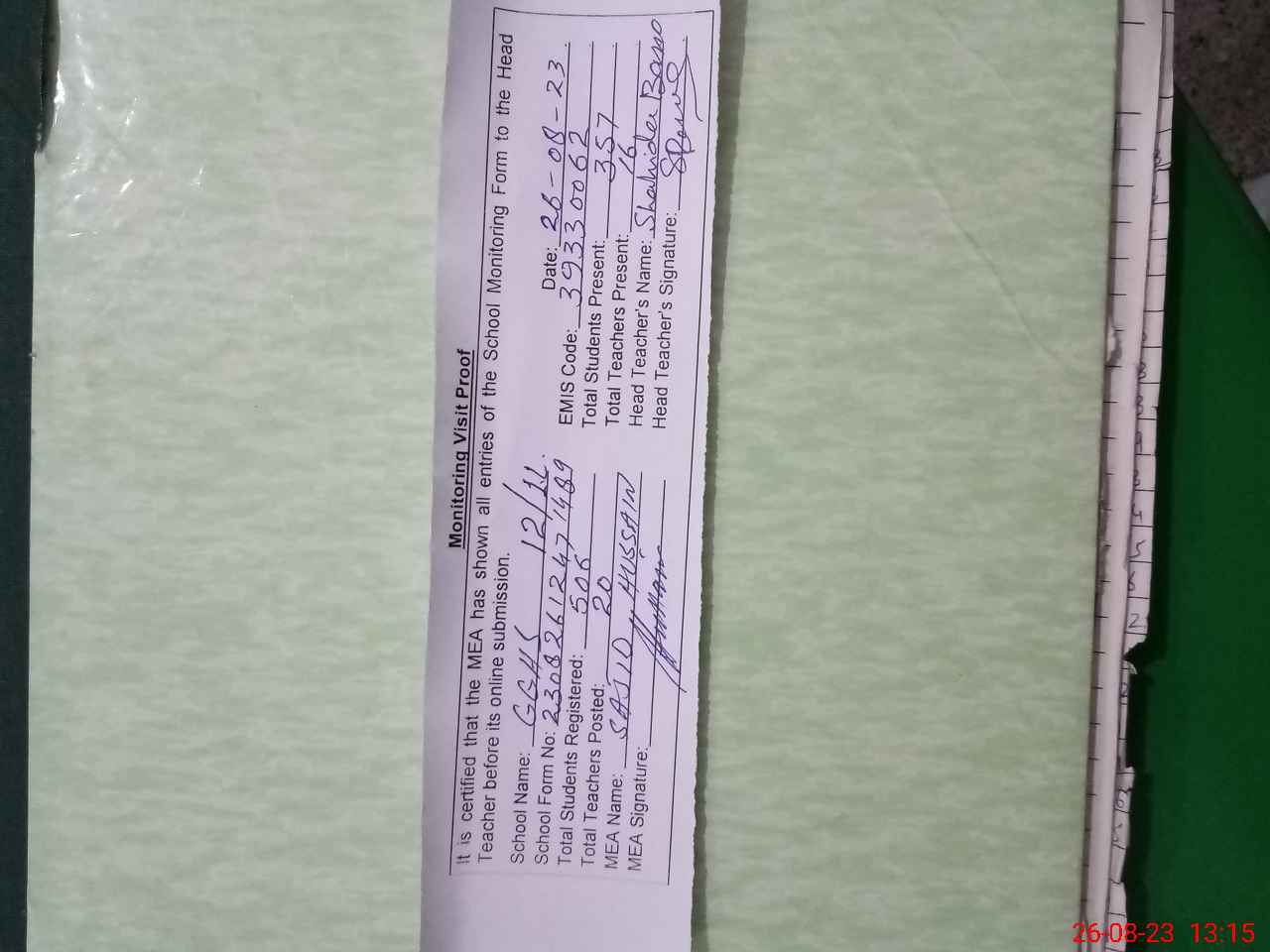 | Attendance Register | Head Teacher | MEA with School | Visit Proof |