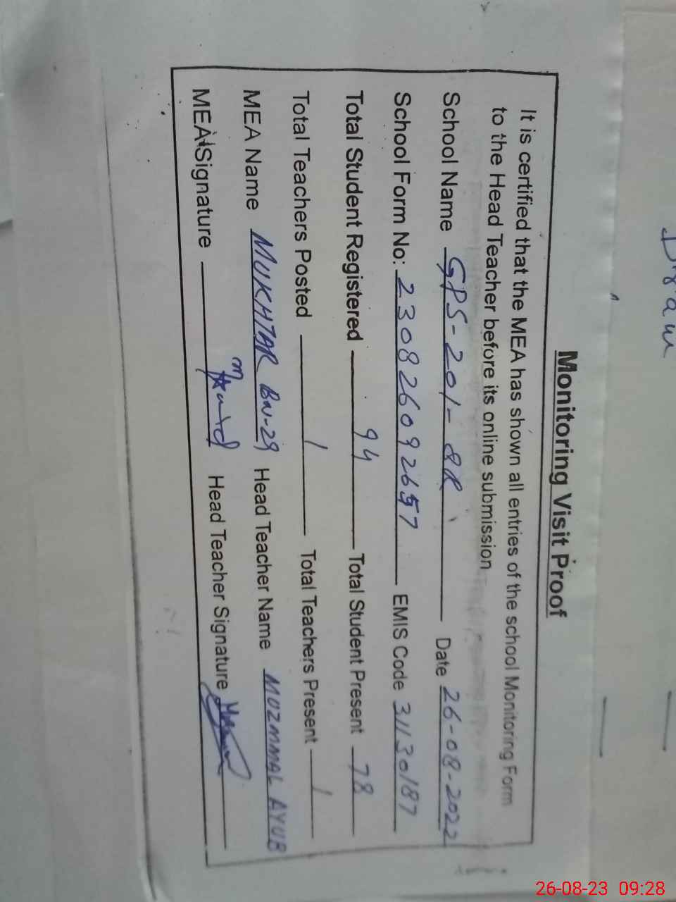 | Attendance Register | Head Teacher | MEA with School | Visit Proof |